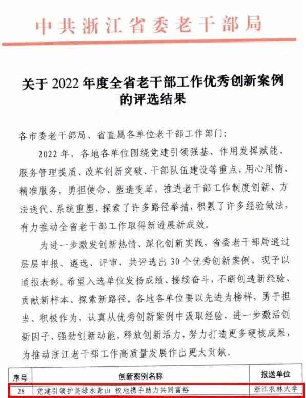 近日,省委老干部局發(fā)文公布,我校離退休工作榮獲多項(xiàng)省級(jí)榮譽(yù)。我校申報(bào)的《黨建引領(lǐng)護(hù)美綠水青山 校地?cái)y手助力共同富裕》獲“全省老干部工作優(yōu)秀創(chuàng)新案例”(全省高校唯一入選),退休教師范義榮老師獲“銀尚達(dá)人”,胥亮、張霞妃老師獲“銀尚之家”(省直屬單位唯一入選)。