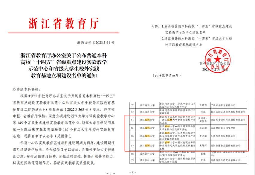 近日,浙江省教育廳公布十四五省級大學生校外實踐教育基地立項建設名單,我校共獲批“浙江農林大學—錢江源國家公園大學生校外實踐教育基地”等4個省級大學生校外實踐教育基地。