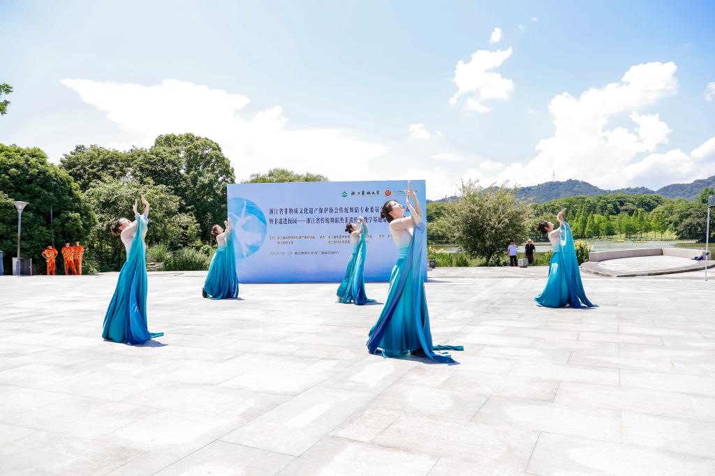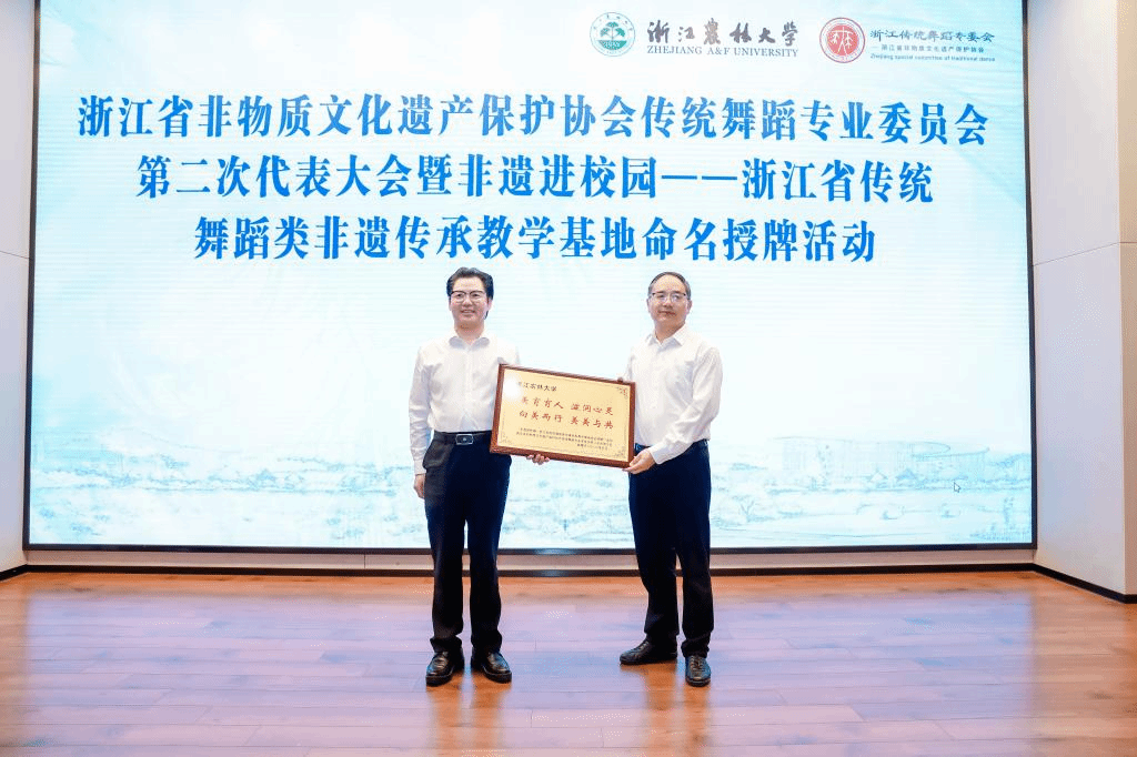 5月28日,浙江省非物質文化遺產保護協會傳統舞蹈專業委員會第二次代表大會暨非遺進校園——浙江省傳統舞蹈類非遺傳承教學基地命名授牌活動舉辦。浙江省文化和旅游廳副廳長、省非遺協會會長葉菁,浙江農林大學副校長胡祖吉,省非遺協會副會長兼秘書長、省非遺保護中心黨總支書記兼副主任吳延飛、省非遺協會傳統舞蹈專委會第一屆主任委員吳露生出席活動。