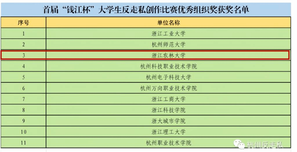 近日,第二屆全國大學生反走私創作大賽獲獎名單、首屆“錢江杯”大學生反走私創作比賽獲獎名單先后公布。在第二屆全國大學生反走私創作大賽中,我校獲高校組優秀組織獎,3件學生作品獲優秀獎,郭冰老師獲優秀指導教師獎。在首屆“錢江杯”大學生反走私創作比賽中,我校獲優秀組織獎,文法學院譚解等創作的《反走私風云》獲得視頻類作品三等獎,另有11件學生作品獲優秀獎,郭冰、周雪嶠2名老師獲優秀指導教師獎。