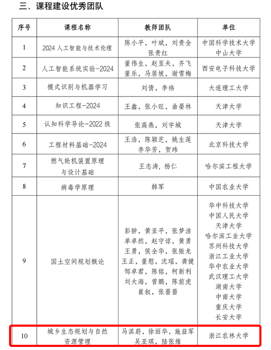 1月16日,教育部重點領(lǐng)域教學(xué)資源建設(shè)項目管理辦公室發(fā)布了《關(guān)于公布2024年度優(yōu)秀團(tuán)隊的通知》,結(jié)合“知譜空間”與虛擬教研室平臺建設(shè)應(yīng)用數(shù)據(jù),經(jīng)相關(guān)專家評審與論證,遴選出16個優(yōu)秀專家團(tuán)隊、16個教材建設(shè)優(yōu)秀團(tuán)隊,10個課程建設(shè)優(yōu)秀團(tuán)隊、1家資源建設(shè)特別貢獻(xiàn)單位予以表彰。園林學(xué)院城鄉(xiāng)規(guī)劃學(xué)學(xué)科馬淇蔚副教授、徐麗華教授、施益軍副教授、吳亞琪老師、陸張維副教授負(fù)責(zé)建設(shè)的《城鄉(xiāng)生態(tài)規(guī)劃與自然資源管理》課程,被評為課程建設(shè)優(yōu)秀團(tuán)隊。